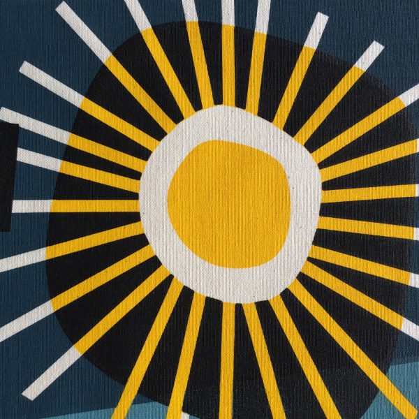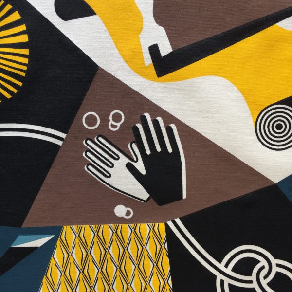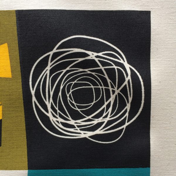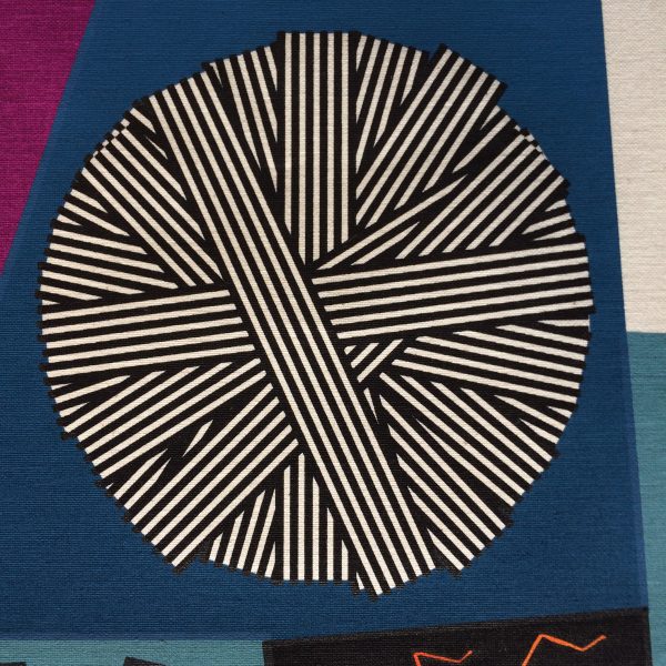 Beide fühlen wir uns zum Stil der 50er und 60er Jahre hingezogen und es war schnell klar, daß wir als ästhetischen Überbau die Formensprache des Midcentury für unseren Wandbehang wählen: fließende, organische Kurven und reduziert-geometrische Formen verwoben mit einem inhaltlich zeitgenössischen Kontext.