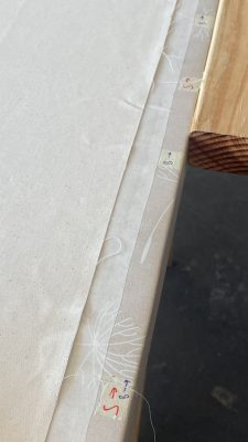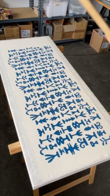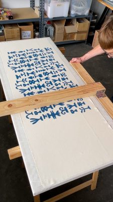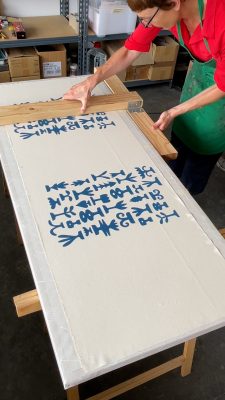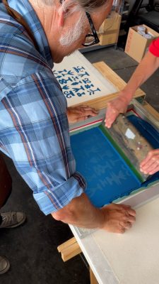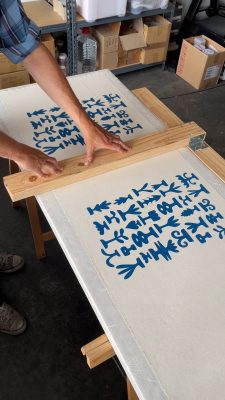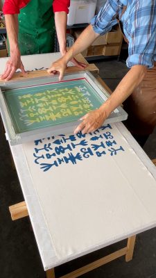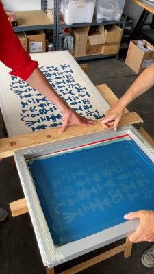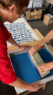 In dieser ersten einfachen Variante benutzen wir ein Sieb das in etwa so hoch ist wie der Drucktisch – insgesamt soll unser einfarbiges Muster viermal nebeneinander gedruckt werden. Damit unser Sieb nach dem ersten Druck nicht in die nasse Farbe gelegt wird überspringen wir wie üblich den Platz des benachbarten zweiten Drucks und drucken zunächst an übernächster Stelle. Nach dem Trocknen dieser beiden Musterstellen 1 und 3 folgen 2 und 4.