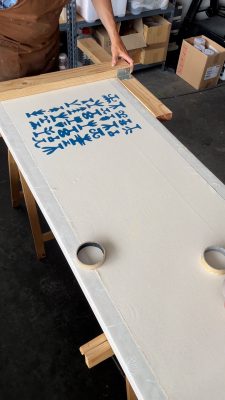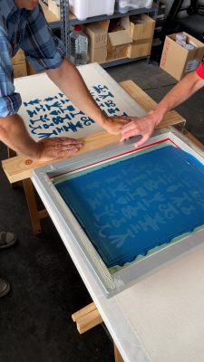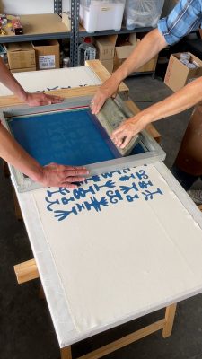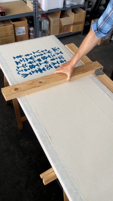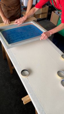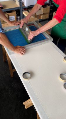 Bevor das Sieb angelegt ist sollte sichergestellt sein dass das T-Bar korrekt platziert ist und gut an der Tischkante anliegt – so entsteht der wichtige rechte Winkel. Nachdem das Sieb vorsichtig angelegt wurde sollte es beim Druckvorgang festgehalten werden damit es nicht rutscht. Den Vorgang wiederholen wir an Position 3, danach wird zwischengetrocknet (wir waschen in dieser Zeit das Sieb sicherheitshalber aus).