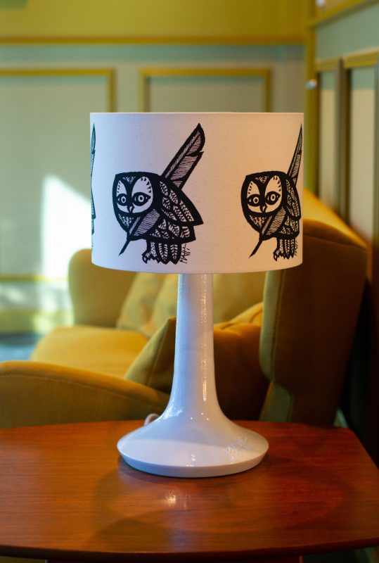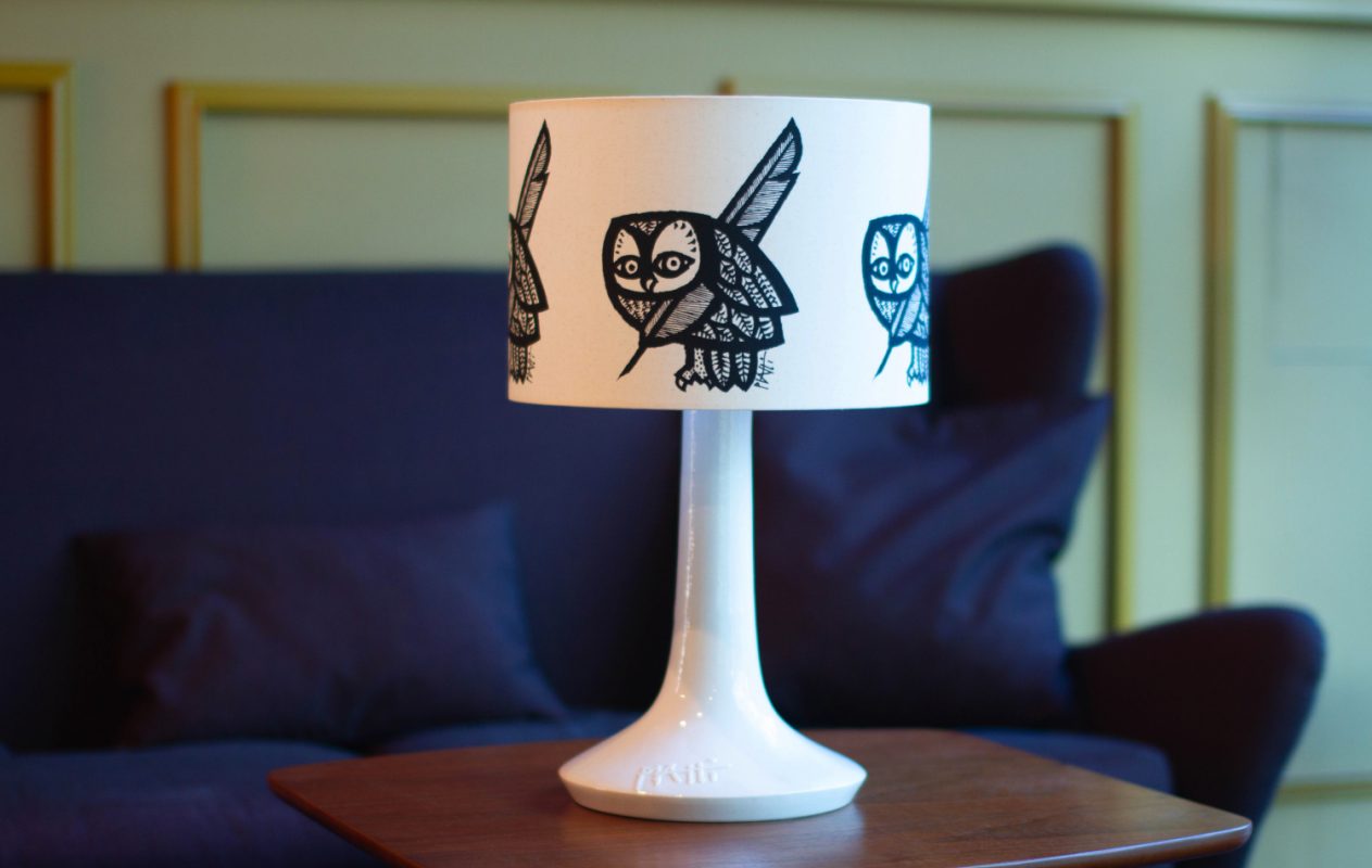 Aus einer Fülle von fantastischen Eulengrafiken – viele davon konnten wir im Original während unseres Besuchs im Archiv bestaunen – haben wir schließlich zusammen mit Barbara Piatti einen Favoriten ausgewählt, was sicherlich keine leichte Entscheidung war. Aber insbesondere im Einsatz als Leseleuchte passt die Eule mit der Schreibfeder einfach perfekt.