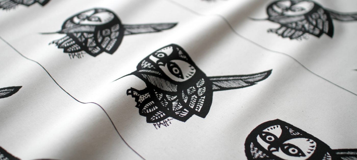 Der Siebdruck auf Stoff war recht anspruchsvoll: Auch die Feinheiten der Tuschezeichnung der Originalgrafik sollten einwandfrei reproduziert werden. Nach einigen Tests war das Druckbild perfektioniert und unser sechs Meter langer Drucktisch flugs bevölkert mit vielen, vielen Eulen…