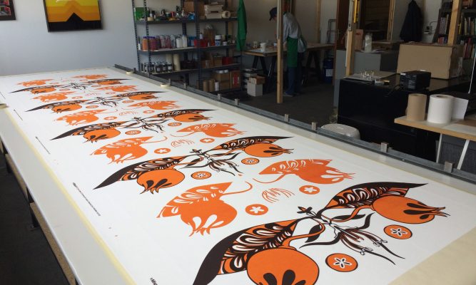 Wir drucken mit dem DIY-Stoffdrucktisch ein einfarbiges Muster im vierfachen Rapport.