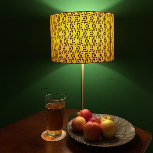 For this lampshade we have again been inspired by the local cider culture. This two-coloured silkscreen print on Mollino fabric is part of our series “Das Stöffsche zum Stöffsche”. In the Frankfurt area “Stöffsche” stands not only for textiles but also for the local cider. The “Goldraute” (golden rhombus) is an allusion to the cut of the “ribbed” – the classic glass from which cider is drunk.
