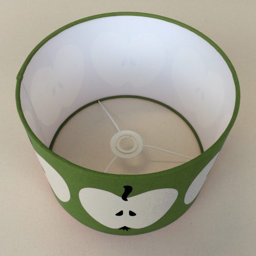 All made by hand: two-coloured screen print on mollino from our series “Das Stöffsche zum Stöffsche”, mounted on lampshade foil. The decorative “Renette” lampshade gives every floor lamp an atmospheric look – the halved apples in vintage look shine in a warm natural fabric tone, together with the green base colour a pleasant lighting atmosphere is created.