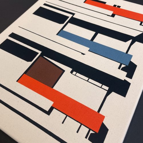 Alle Drucke dieser Serie spielen mit der Formsprache von Bauten der Moderne (ca. 1920-1960). Die linearen Schattenwürfe und starken Farbkontraste unterstreichen einerseits die strikte Orthogonalität, brechen sie aber gleichzeitig auch auf – eine Spannung die sich zumindest für uns so nur in der Architektur dieser Zeit findet.
