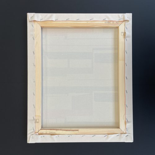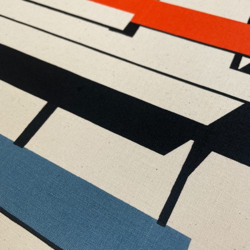 Dreifarbiger Siebdruck auf naturfarbenem Canvas, fixiert auf Keilrahmen.