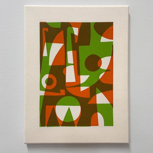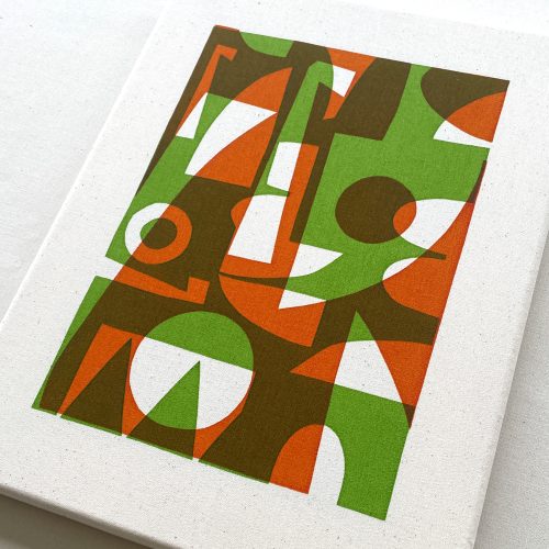 Ein bildnerisches Spiel mit abstrakten Formen und Überlagerungen, angelehnt an klassisches Midcentury-Modern-Design. Und der Name ist Programm: Beim sogenannten „Stencil“-Druck verwenden wir keine belichteten Siebe für den Druck sondern benutzen Formenschablonen die mittels Scherenschnitt entstanden sind.